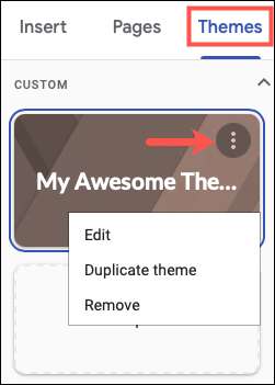 Kenar çubuğundaki Temalar sekmesini tıklayın ve Özel'i genişletin. Tema seçeneklerini açmak için üç noktaya tıklayın ve ardından bir eylem seçin.