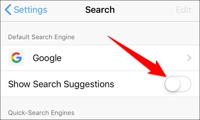 Aşağı doğru açan "Ara" sayfasını kaydırın. Alt kısımda, "Arama Önerilerini Göster" seçeneğini devre dışı bırakın.