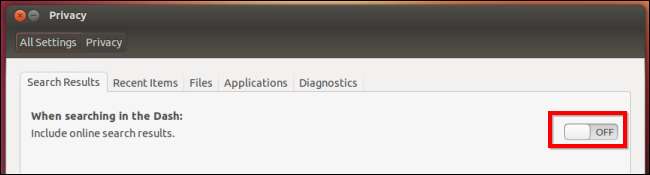 Yı kur Çevrimiçi arama sonuçlarını dahil et Kaydırıcıyı Kapalı konumuna getirirseniz, Ubuntu’nun panelinde Amazon reklamları görmezsiniz.