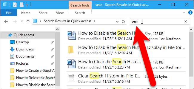 Yeniden başlattıktan sonra, Dosya Gezgini'ndeki Arama kutusuna bir terim yazdığınızda herhangi bir arama geçmişini görmezsiniz.