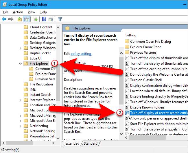 Sol bölmede, Kullanıcı Yapılandırması> Yönetim Şablonları> Windows Bileşenleri> Dosya Gezgini'ne (Windows 7'de Windows Gezgini) gidin, ardından sağ bölmedeki "Windows Gezgini arama kutusundaki son arama girişlerinin görünümünü kapat" öğesini çift tıklayın.