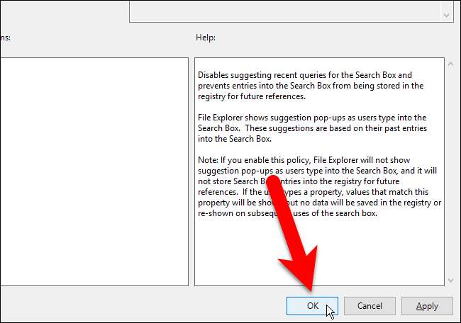 Değişikliği kabul etmek ve "Dosya Gezgini arama kutusundaki son arama girişlerinin görünümünü kapat" iletişim kutusunu kapatmak için "Tamam" ı tıklayın.