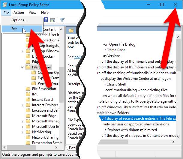 Grup İlkesi Düzenleyicisini, Dosya> Çıkış'ı seçerek veya pencerenin sağ üst köşesindeki “X” işaretini tıklayarak kapatın.