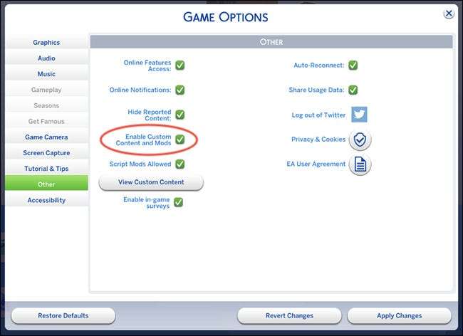 Başlattıktan sonra Sims 4 oyun, ana menünün sağ üst köşesinde üç nokta simgesi göreceksiniz. Bunu tıkladığınızda ayarlar menüsünü göreceksiniz. "Diğer" sekmesini tıklayın ve ardından "Özel İçeriği ve Modları Etkinleştir" seçeneğini seçin.