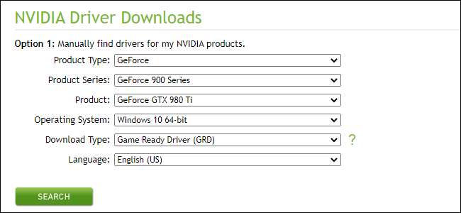 Sürücüleri NVIDIA’nın web sitesinden indirebilirsiniz. Ya yeniye gidin GeForce Sürücüler sayfası ve "Manuel Sürücü Arama" bölümünü kullanın veya klasik NVIDIA Sürücü İndirme sayfası .