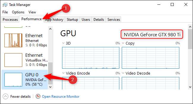 Buradaki kenar çubuğundaki "GPU" girişini seçin. Görev Yöneticisi penceresinin sağ üst köşesinin yakınında GPU'nuzun adını bulun.