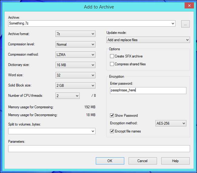Başka hiçbir özgür, açık kaynak yok şifreleme araçları Windows'ta cilalı. TrueCrypt, herkesin etrafında toplandığı bir araçtı. Ancak yine de diğer araçları kullanabilirsiniz. Örneğin, 7-Zip ve diğer dosya arşivleme araçları yerleşik şifreleme içerir. Açmak için bir şifreye ihtiyacınız olan AES-256 şifreli bir arşiv dosyası oluşturmak için 7-Zip'i kullanabilirsiniz. Bu çözüm, tüm sabit sürücüyü şifrelemenize izin vermez, ancak birkaç dosyayı şifrelemenize izin verir.