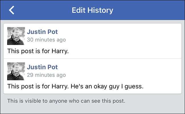 Orijinal yayınınızın hala görüntülenebilir olduğunu unutmamak önemlidir. Bir kişi bir gönderiyi görebilirse, düzenleme geçmişini de görebilir. Facebook, düzenlenmiş gönderilerin yanında "Düzenlendi" ifadesini gösteriyordu, ancak bu yılın başlarında bunu yapmayı bıraktılar.