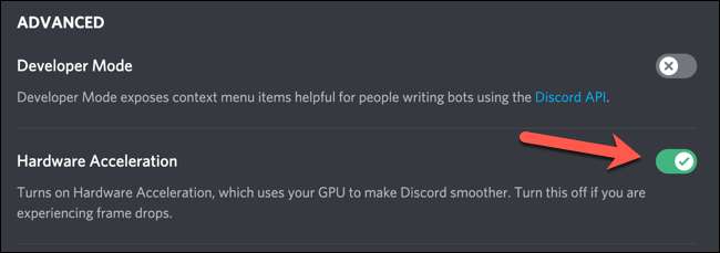 "Gelişmiş" bölümün altında, bunu etkinleştirmek veya devre dışı bırakmak için "Donanım Hızlandırma" seçeneğinin yanındaki kaydırıcıyı tıklayın. Kaydırıcı bir çek sembolü ile yeşil renkte gösterildiğinde, ayar etkindir ve donanım ivmesi etkindir.