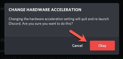 Donanım hızlandırmasını etkinleştirmek veya devre dışı bırakmak için ayarın değiştirilmesi, Discord Müşterinin yeniden başlatılmasını gerektirir. "Donanım Hızlandırılmasını Değiştir" açılır penceresinde, istemciyi onaylamak ve yeniden başlatmak için "Tamam" a tıklayın.