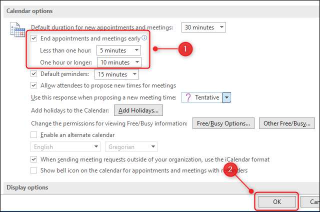 Microsoft Outlook istemcisinin erken saatlerinde toplantıları sonlandırmak için Dosya ve GT; Seçenekler & gt; Takvim ve "Takvim Seçenekleri" bölümüne gidin.