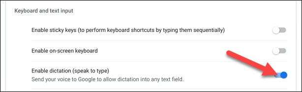Aşağı ve için üzerine geçiş anahtarı Kaydırma “Dikte Enable (Türü Speak).”
