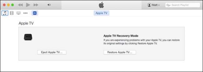 Apple TV'niz bağlandıktan sonra tekrar güç kaynağına takın (2. nesil model hariç). iTunes açmalı (zaten çalışmıyorsa) ve Apple TV'yi tanımalıdır. Oradan, "Apple TV'yi Geri Yükle" yi seçin.