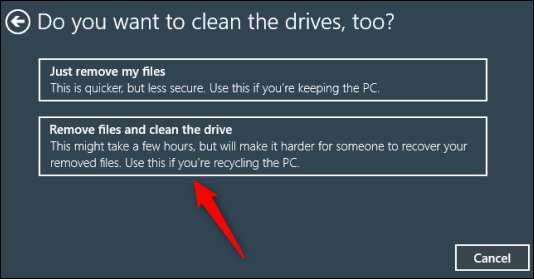Sonra, dosyalarınızı kaldırmak veya dosyalarınızı kaldırmak isteyip istemediğinize karar verin. ve Sürücüyü silin. Eski daha hızlı ancak daha az güvenlidir, ikincisi önemli ölçüde daha uzun sürer (dizüstü bilgisayarımı yaklaşık altı saat aldı.) Ama çok daha güvenli.
