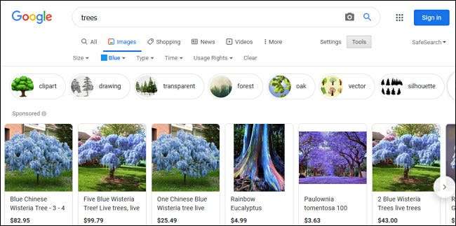 Bundan sonra, arama sonuçları seçtiğiniz rengi yansıtacak şekilde otomatik olarak güncellenir. Baskın rengin seçtiğiniz yerlerin olduğu görüntüleri göreceksiniz. Örneğin, işte bazı mavi ağaçlar!