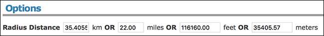 Teorik olarak, bir baz kulesinin menzili 40 milden fazladır, ancak pratikte, hücre servisini alabileceğiniz maksimum mesafe yaklaşık 22 mildir ve bu ideal koşullar altındadır. "Seçenekler" altında, "Yarıçap Mesafesi" ni 22 mil olarak ayarlayacağım. Test etmek istediğiniz değeri girmelisiniz; araç, birkaç fitten dünya çevresinin önemli bir kısmına kadar her şeyle çalışır.