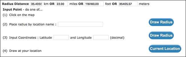 Ardından, dairenin merkezinin konumunu belirlemeniz gerekir. Bunu yapmak için dört seçeneğiniz vardır: haritaya tıklamak, bir konum adı girmek, koordinatları girmek veya kendi konumunuzu çizmek.