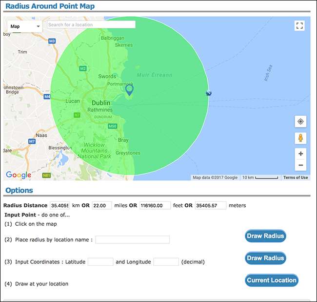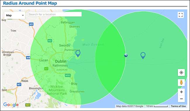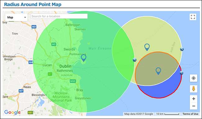Bir Noktanın Çevresindeki Yarıçap aracıyla, yalnızca tek bir daire ile sınırlı kalmazsınız. İhtiyaç duyduğunuz kadar ekleyebilirsiniz. Bu, farklı dairelerin çakıştığı alanlara bakabileceğiniz anlamına gelir. Orada varsayımsal bir hücre kulesi olsaydı ne olacağını görmek için İrlanda Denizi'nin ortasına başka bir daire ekleyeceğim.