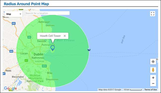 Ve bunun gibi, araç sizin için bir daire çiziyor. Seçtiğim hücre kulesinin Dublin Şehri'nin tamamını kapladığını görebiliyorsunuz, bu da evimdeki hücre sinyallerinin kötü olması her şeyi daha da sinir bozucu hale getiriyor.