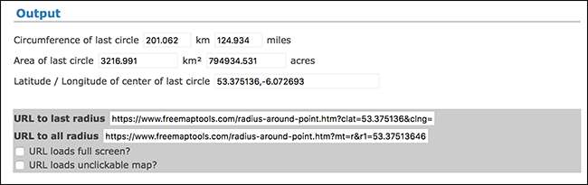 "Son Yarıçapın URL'si" bağlantısı, insanları yalnızca çizdiğiniz en son çevreyi gösteren bir haritaya götürür. "Tüm Yarıçaplara Ait URL" bağlantısı, insanları çizdiğiniz tüm çevrelerin bulunduğu bir haritaya götürür. İşte haritamın bağlantısı .