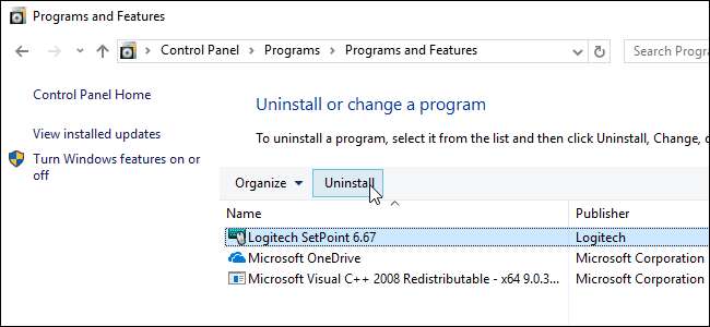 Bu bir sorunsa, fare üreticinizin yardımcı programını kaldırmak isteyebilirsiniz. Bunun kurulu olmasına gerek yoktur. Örneğin, dizüstü bilgisayarınızla ara sıra bir Logitech faresi kullanıyorsanız, ancak SetPoint'in içerdiği düğme yeniden eşleme özelliklerinden hiçbirini kullanmıyorsanız, Denetim Masası'na gidip SetPoint'i kaldırabilirsiniz. Logitech fareniz çalışmaya devam edecek ve her başlattığınızda ayar sıfırlanmayacaktır.
