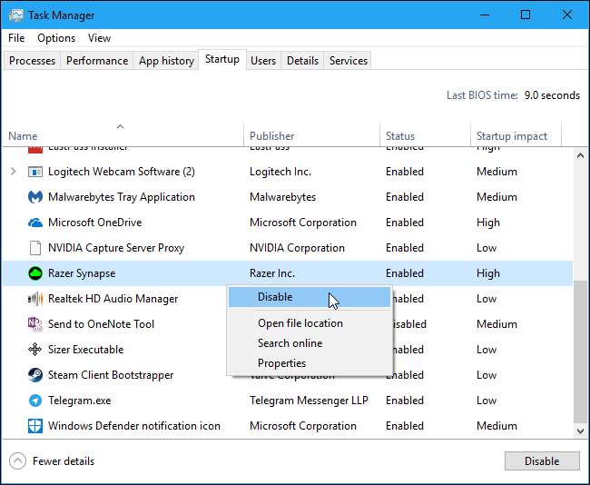 Fare üreticinizin yardımcı programını kaldırmak istemiyorsanız şunları yapabilirsiniz: açılışta çalışmasını engelle . Windows 10 veya 8'de, görev çubuğuna sağ tıklayıp "Görev Yöneticisi" ni seçerek, Başlangıç sekmesinde yardımcı programı bulup sağ tıklayıp "Devre Dışı Bırak" ı seçerek Görev Yöneticisini açabilirsiniz.