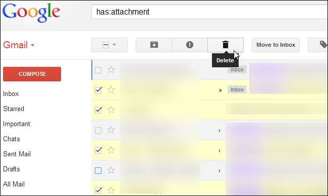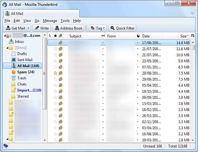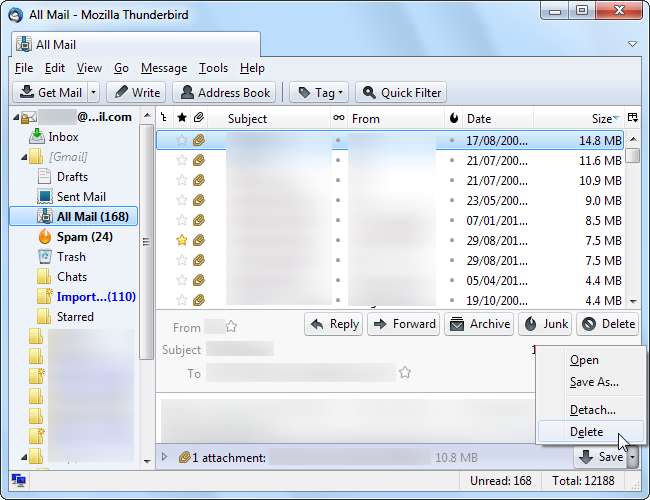 Yine de onları silmeniz gerekmez - büyük olasılıkla ekler yer kaplıyor, mesajların kendisi değil. Mesajı web arayüzünden silmeden mesajdaki bir eki kaldıramazken, bir IMAP istemcisinden ekleri kolayca kaldırabilirsiniz. Ek, e-posta metni olduğu gibi bırakılarak hesaptan silinecektir.
