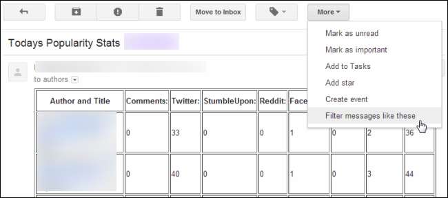 Toplu postayı hızlı bir şekilde silmek için iletilerden birini bulun, açın, Diğer menüsünü tıklayın ve "Bunun gibi iletilere filtre uygula" yı seçin.