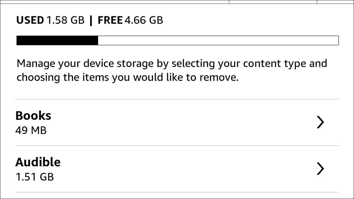 İçine dokunun ve farklı türden bazı Kindle içeriğinin ne kadar alanın alacağının bir dökümü göreceksiniz.