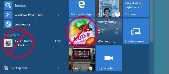 Windows 10, ilk oturum açtığınızda Candy Crush Soda Saga ve FarmVille 2 gibi uygulamaları otomatik olarak yükler. Ayrıca, Mağaza'dan hem Başlat menünüzün sol tarafında hem de sağ tarafta canlı döşemeler olarak daha fazla "Önerilen Uygulamalar" görüntüler. Başlat menünüzü temizlemek için bunları devre dışı bırakabilirsiniz.