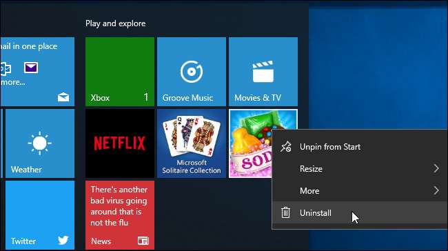 Bu uygulamalardan kurtulmak için, sadece Başlat menünüzü açın, kutucuklarına sağ tıklayın ve "Kaldır" ı seçin. Uygulama, sisteminizden hemen kaldırılacaktır. Bazı durumlarda, önerilen uygulamalar için kutucuklar sabitlenmiş olabilir ve uygulama henüz yüklenmemiş olabilir. "Kaldır" seçeneğini görmüyorsanız kutucuktan kurtulmak için "Baştan Çıkar" ı tıklamanız yeterlidir.