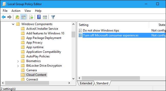 Bunu yapma seçeneği Bilgisayar Yapılandırması> Yönetim Şablonları> Windows Bileşenleri> Bulut İçeriği altında bulunur. "Microsoft tüketici deneyimlerini kapat" politikasını buradan etkinleştirin. Bu değişikliği yaptıktan sonra oturumu kapatıp tekrar açmanız gerekecek.