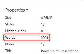 "Özellikler" grubu genişleyecektir. "Kelimeler" seçeneğinin yanında, PowerPoint slaytlarının ve notların kelime sayısını görebilirsiniz. "Notlar" seçeneğinin, notların kelime sayısından ziyade PowerPoint sunumunda kaç notun göründüğünü gösterir.