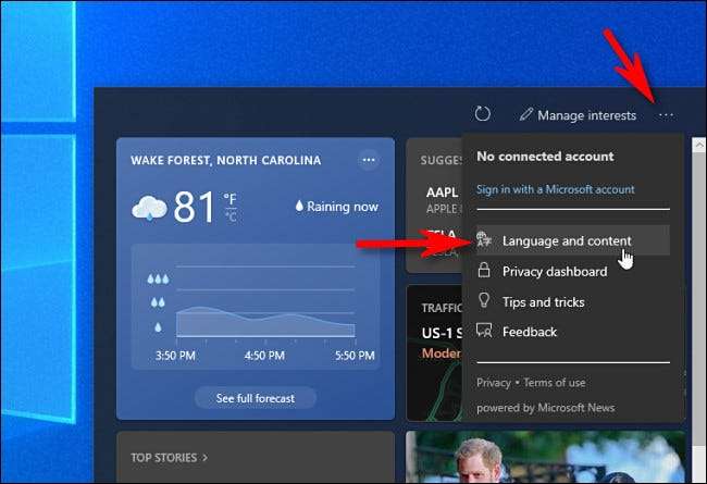Widget'ı tamamen açmak için görev çubuğunuzdaki (hava tahmini) içindeki widget düğmesini tıklayın. Açık olduğunda, widget'ın sağ üst köşesindeki üç noktalı menü düğmesini tıklayın. Ardından, menüden "Dil ve İçerik" seçeneğini seçin.