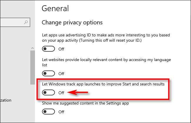 Hangi uygulamaları en çok kullandığınızı takip eden Windows özelliğini tamamen devre dışı bırakmak istiyorsanız, "Ayarlar" nı açın ve Gizlilik ve GT'ye gidin; Genel. Geçişi çevirin "Windows Track App, Başlangıç ve Arama Sonuçlarını Geliştirmek için Başlatalım" ı "Kapalı."