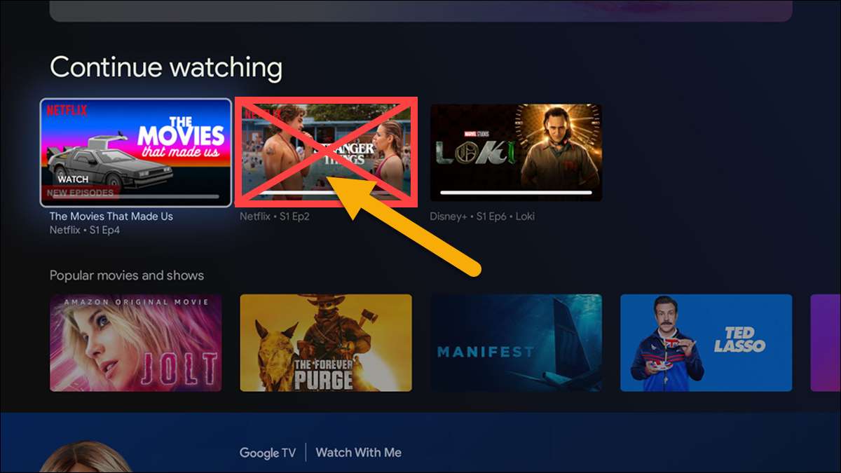 NS Google TV Ana Ekranı tavsiyelere odaklanmış ve bıraktığınız yerden almanızı kolaylaştırır. Bazen, "izlemeye devam et" sırası süper yardımcı olmuyor. Neyse ki, başlıkları satırdan kaldırabilirsiniz.