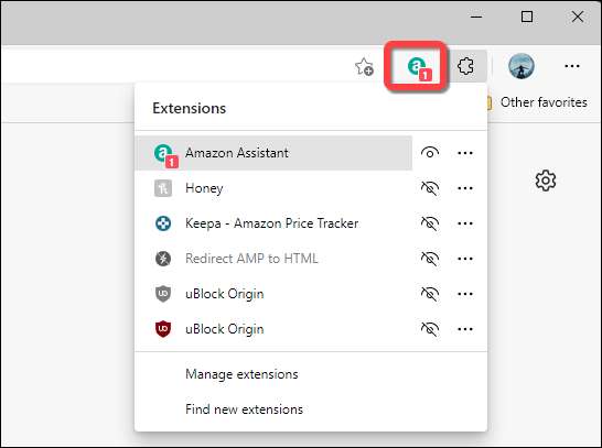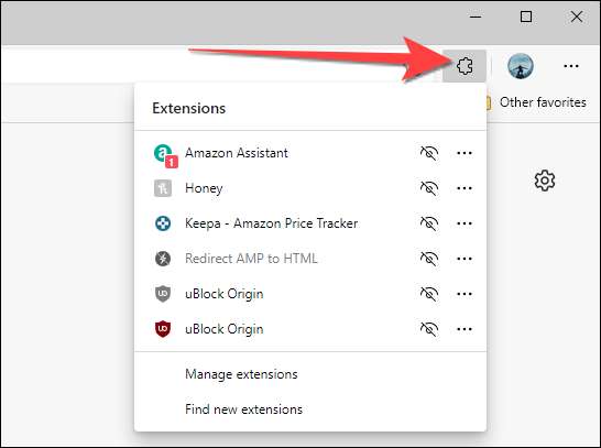 İlk önce, Microsoft Edge'i başlatın ve sağ üst köşedeki araç çubuğundaki "uzantılar" simgesini seçin.