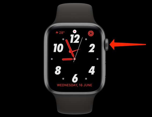 Kırmızı noktayı doğrudan Apple Watch'ınızdan gizleyebilirsiniz. Bunu yapmak için, ekrana bir kez dokunarak saatinizdeki ekranı uyandırın. Ardından, Apple Watch'ın yanındaki büyük dairesel düğme olan dijital taç düğmesine basın.