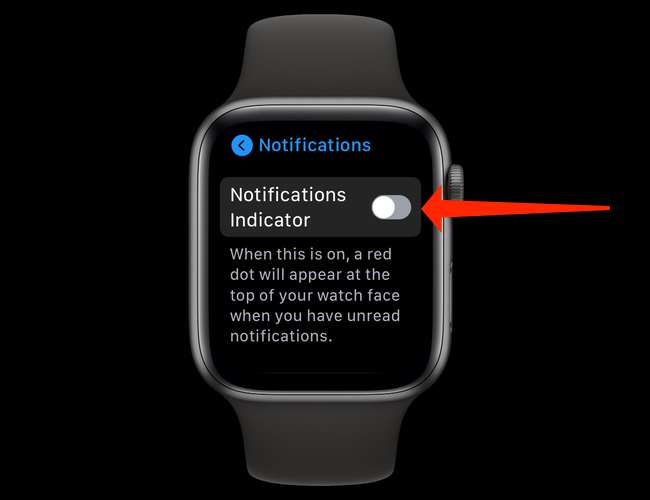 Apple Watch bildirim ayarlarında ilk seçenek "Bildirimler göstergesi" olarak adlandırılır. Kırmızı noktayı Apple Watch'ınızdaki gizlemek için "Bildirimler Göstergesi" nin yanındaki düğmeye dokunun. Anahtar yeşil ise, açık olacağını unutmayın. Yeşil değilse, kapalı.