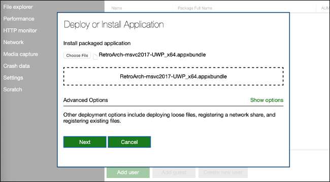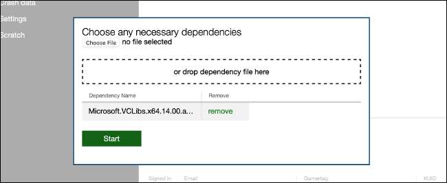Dosya yükleme arayüzüne erişmek için Ana Sayfa'da "Ekle" seçeneğini seçin ve ardından kutuya indirdiğiniz AppXBundle dosyasını sürükleyip bırakın (veya "Dosya'yı seçin" seçeneğini tıklayın ve bulun). "İleri" yi seçin ve ardından indirdiğiniz bağımlılık dosyasını bulun.