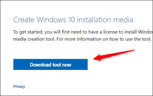 Sonra, Resmi indirme Windows 10 sayfa Microsoft web sitesinde. "Windows 10 Yükleme Medyası Oluştur" bölümünde, Mavi "İndirme aracını şimdi" düğmesini tıklayın.