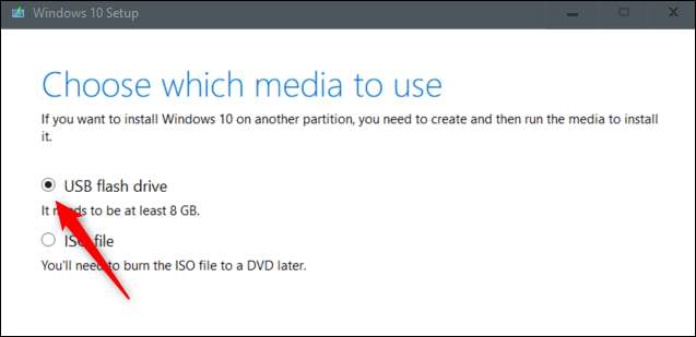 Bir sonraki ekranda, hangi ortamın kullanılacağını seçmelisiniz. Seçmek için "USB Flash Sürücü" nin yanındaki balonu tıklatın ve sonra "İleri."