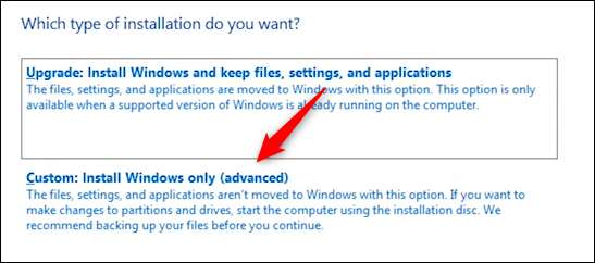 Bir sonraki ekran, hangi yükleme türünü yapmak istediğinizi seçmenizi ister. Yaptığımızdan beri taze kurulum , "Özel: Sadece Windows'u kurun (Gelişmiş)."