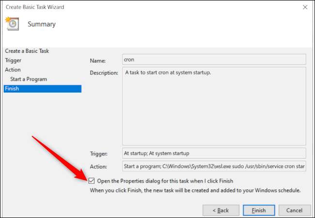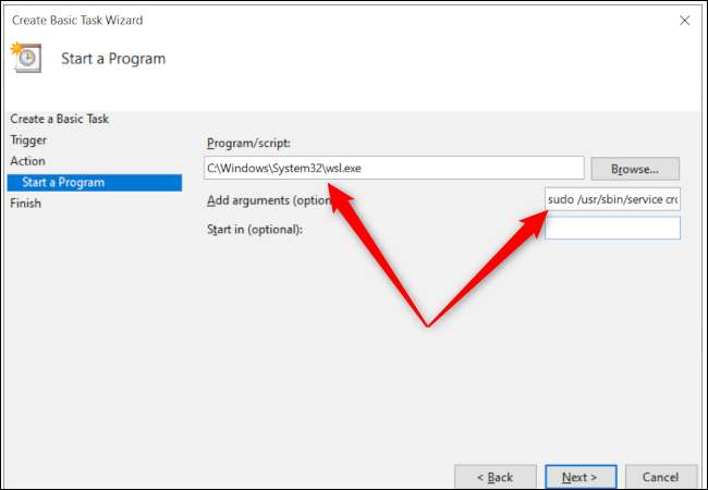 Ayrıca şu ana kadar yaptığım tüm wsl başlatmak, ancak iç WSL, biz cron'u başlatmak için Ubuntu anlatmaya gerek çünkü bazı argümanları eklemeniz gerekir. Yani, “Argümanlar Ekle” kutusuna ekleyin: