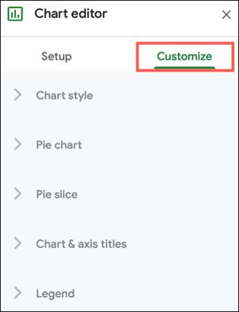 Grafik Düzenleyici Kenar Çubuğunun üstündeki Özelleştir sekmesini tıklayın. Birkaç bölüm göreceksiniz; Çoğu herkes için kullanılabilir Google sayfalarında kullandığınız grafik türleri .
