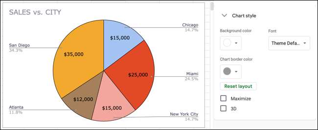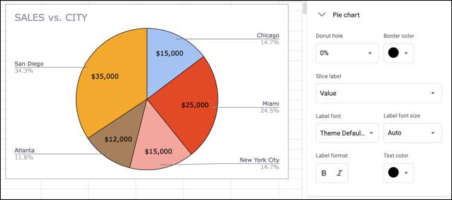 Altında Yuvarlak diyagram , merkezde bir çörek deliği ekleyin ve ayarlayın veya pasta için bir sınır rengi seçin. İsterseniz bireysel dilimlere etiket ekleyebilirsiniz. Etiket, değer, yüzde veya değer ve yüzde seçiminden seçim yapabilirsiniz. Dilim etiketleri eklerseniz, yazı tipi stilini, boyutunu, formatını ve rengi biçimlendirebilirsiniz.