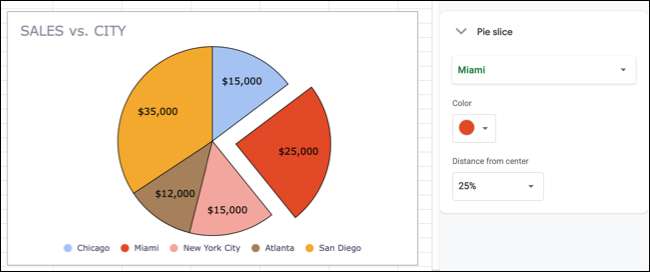 İçinde Pasta dilimi BÖLÜM, açılır listeden birini seçerek bireysel dilimlerin rengini değiştirin ve ardından aşağıda bir renk seçerek. Belirli dilimleri çizelgenin ortasından çıkmasını sağlamak için orta açılır kutuya olan mesafeyi de kullanabilirsiniz.