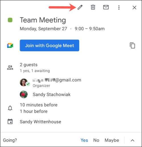 Eğer etkinliği zaten yarattıysanız, isteğe bağlı bir katılımcı yapabilirsiniz. Küçük detay penceresini açmak için Google Takviminizdeki olayı seçin ve ardından düzenlemek için kurşun kalem simgesine tıklayın.