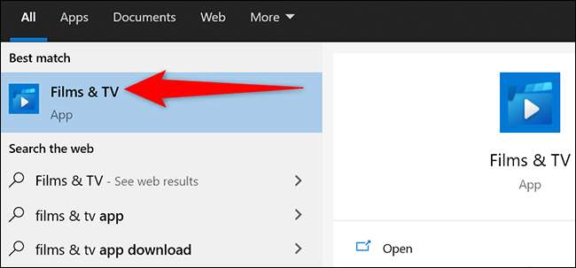 Başlamak için, filmleri ve amp'u açın; Windows 10 PC'nizde TV uygulaması. Bunu "Başlat" menüsünü açarak yapın, "Filmler ve Amp; TV "ve arama sonuçlarına tıklayarak.