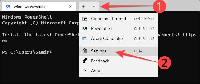 Windows Terminal uygulamasını başlatın, aşağı ok menüsünü seçin ve "Ayarlar" ı tıklayın. Veya "ayarları" açmak için CTRL +, (virgül) düğmesine basabilirsiniz.